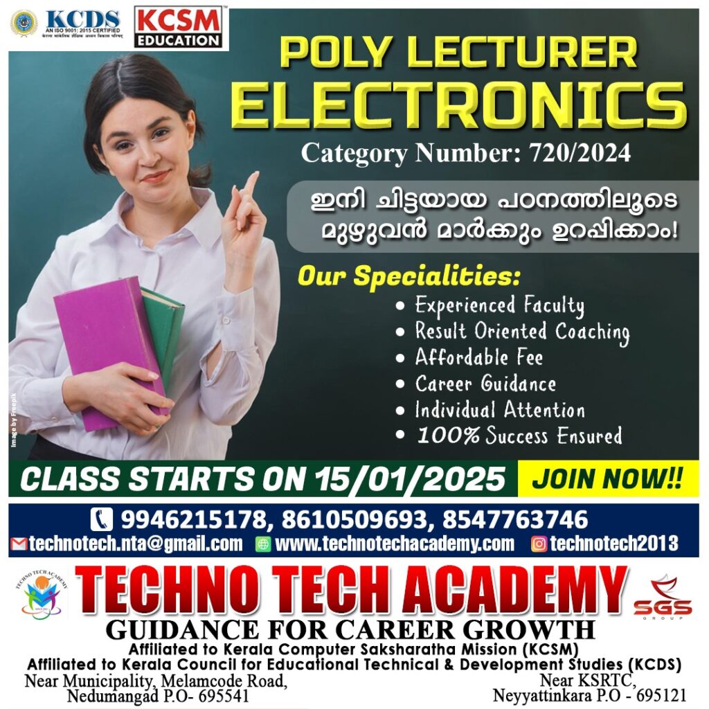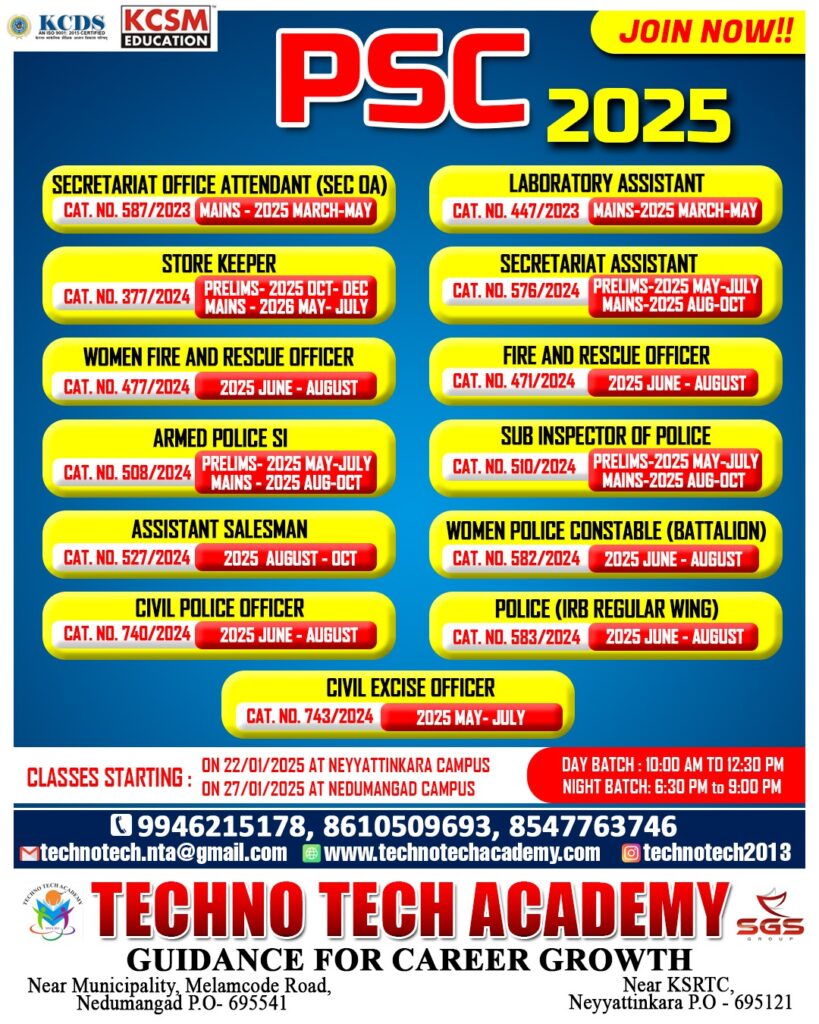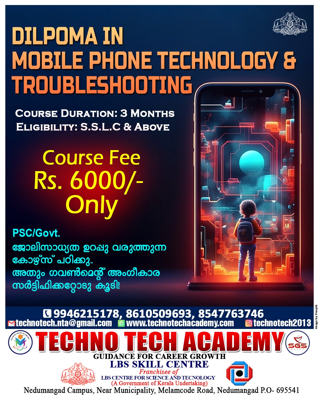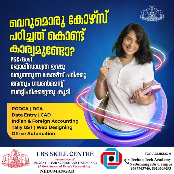 കേരള സർക്കാരിന്റെ കീഴിൽ പ്രവർത്തിക്കുന്ന LBS സ്കിൽ സെന്ററിന്റെ അംഗീകാര സ്ഥാപനമായ നെടുമങ്ങാട് പ്രവർത്തിക്കുന്ന ടെക്നോ ടെക് അക്കാദമിയിൽ 2025 – 2026 അധ്യാന വർഷത്തിലേക്ക് ഒരു വർഷ ദൈർഘ്യമുള്ള PSC അംഗീകാരമുള്ള DCA, PGDCA കോഴ്സുകൾക്ക് അപേക്ഷ ക്ഷണിച്ചു.
